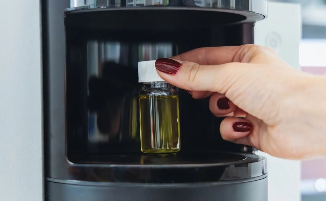 En gjennomsiktig flaske med harpiks plasseres i printeren. Foto: Perfi