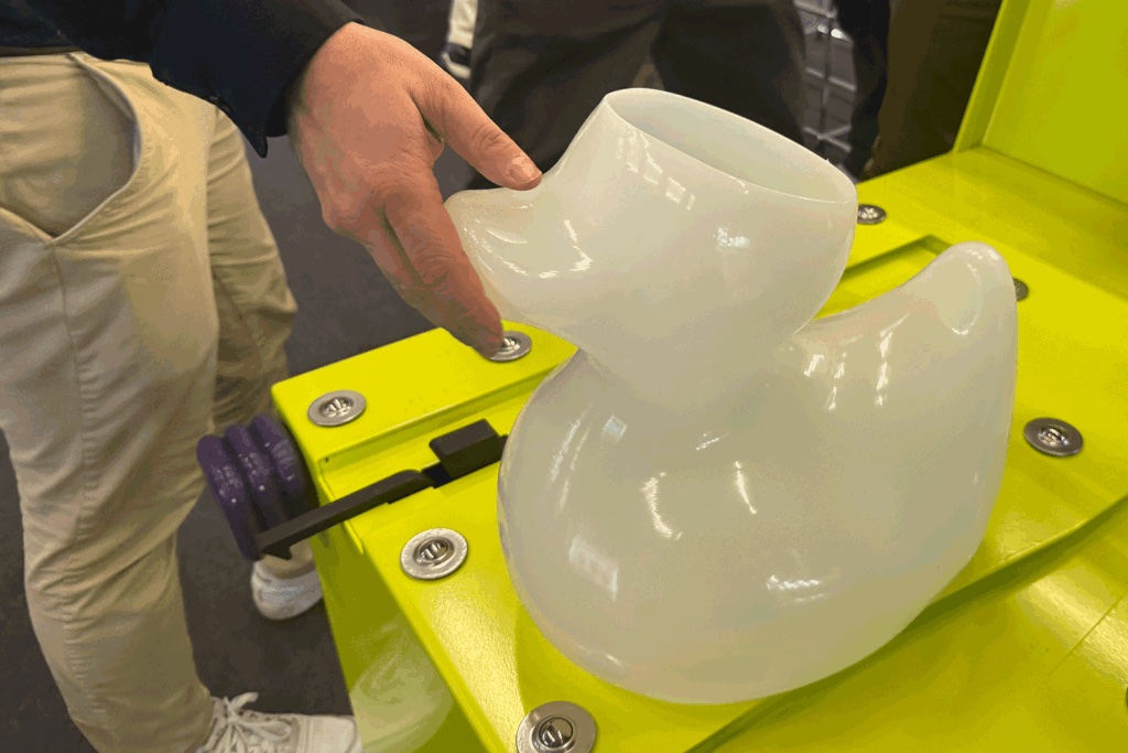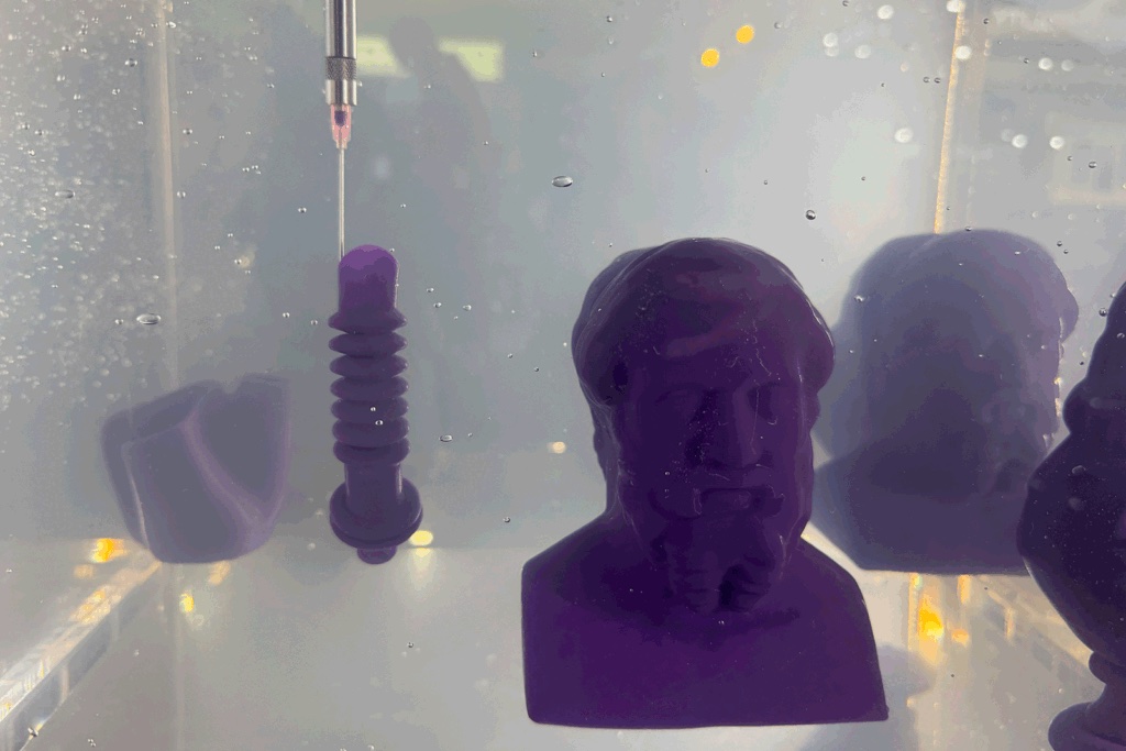– Ja, et selskap fra Boston som heter RLP som ekstruderer silikon inni en stor gelkube. Det er så innmari kult, folk bare står der og måper. Det er sannsynligvis den andre utstilleren jeg har sett foruten Stratasys som bruker industriell silikon. Jeg skulle snakke mer om det på SVEATs arrangement med speidere fra Formnext.