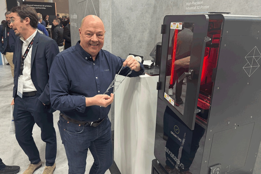 Protech har vært Stratasys-forhandler siden 1990-tallet, og det første åpenbare stoppet var derfor deres stand. Det Anders Brask fremhever som en viktig nyhet er et nytt ekte silikonmateriale. P3 Silicone 25A er utviklet for DLP-plattformen Origin, og Stratasys har utviklet det sammen med Shin-Etsu, som er en ledende produsent av silikon. 3D-printing av silikonkomponenter kan være et mer tids- og kostnadseffektivt alternativ til sprøytestøping.
