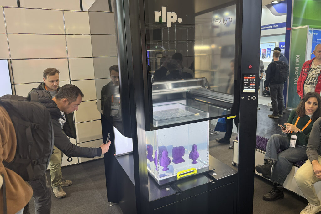 Blant andre foredragsholdere var Anders Brask, som allerede har delt noen av sine oppdagelser med 3dp Norge. Ikke minst RLPs Levity-system for ekstrudering til såkalte hydrogeler, som består av lange polymerkjeder. Med en lang dyse kan silikon printes inn i gelen uten støttematerialer, topografisk fra bunn til topp. En innovasjon som virkelig skilte seg ut, og det var sannsynligvis en av de mest fotograferte maskinene på messen.